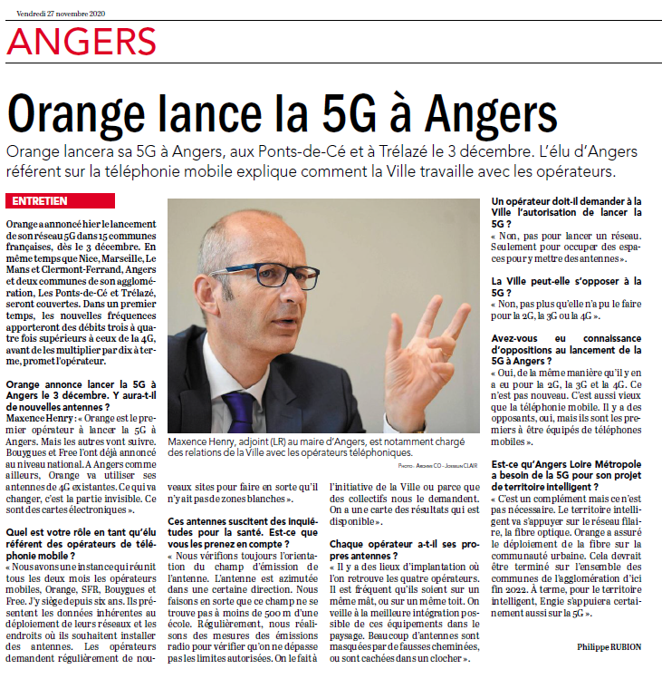 Article paru dans le Courrier de l’Ouest du 27 Novembre 2020 à la suite de l’annonce par Orange de l’ouverture de la 5G à Angers, Trélazé et Les Ponts de Cé.